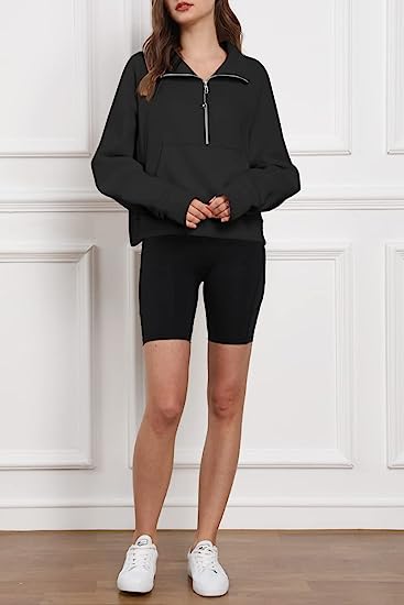 • ★Design: women's fleece lined athletic hoodies, women pullover sweatshirt, drop shoulder collar, kangaroo pockets, long sleeve with thumb holes, help keep your sleeves in place, 1/2 zip up collar, the zipper works smoothly, solid color, stand collar, fleece lined, soft inside, relaxed fit, crop top, fall/winter outfits for women.